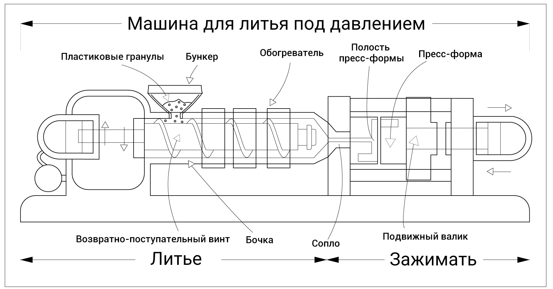 Формовочный инструмент установлен на подвижной платформе – когда деталь затвердевает, платформа открывается, и деталь извлекается с помощью выталкивающих штифтов.